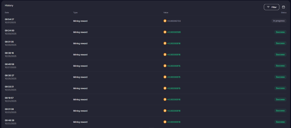 Mi plan es minar BTC hasta alcanzar el mínimo de retiro sin comisiones, que es de 0.0001 BTC (aprox 11$ a precio actual) para así no perder nada. Después reinvertir en más potencia un par de días y volver a empezar. De esta manera planeo recuperar mi inversión inicial y, una vez ahí, seguir creciendo y ganando BTC. Las retiradas pone que tardan 24h, pero a mi no me tardó ni 12h.
